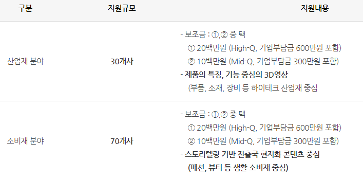 제품 특성과 마케팅 방식에 따라 다양한 형태(3D, 스토리텔링 등)의 홍보동영상 컨텐츠 제작(100개사 내외) 및 고비즈코리아 등록