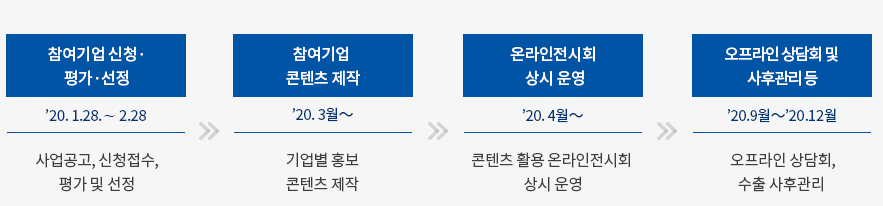 온라인 전시관 구축 운영 및 온라인 홍보, 바이어 매칭률 제고를 위해 1:1 수출상담회, 전시회, 한류마케팅 등 온·오프라인 마케팅과 병행