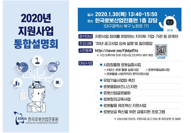 한국로봇산업진흥원(원장 문전일)은 오는 30일(목) 오후 2시, 대구 본원 강당에서 ‘2020년 지원사업 통합설명회’를 개최한다고 밝혔다.