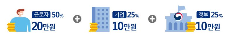근로자가 50%인 20만원을 적입 + 기업이 25%인 10만원을 적립 + 정부가 25%인 10만원을 적립하여 1인 숙박여행 비용 40만원을 지원하게 됩니다.